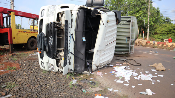 Hậu quả khiến 32 tấn hạt điều khô trên thùng container bị hất văng tràn vương vãi đầy ra hai mặt đường.