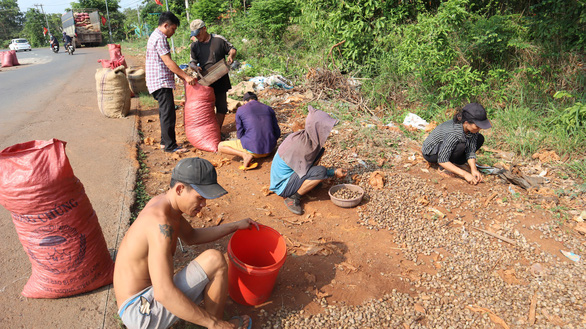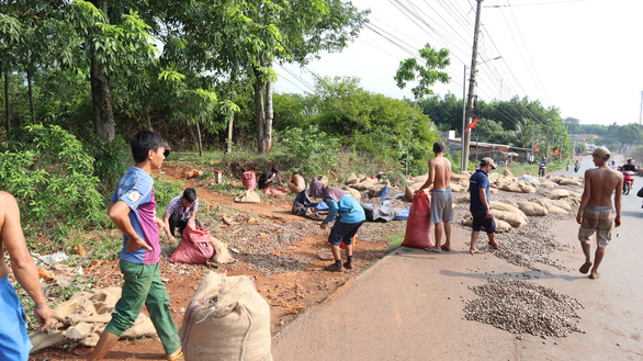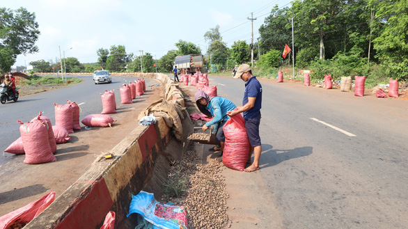 Mặc dù số lượng hạt điều bị tràn ra đường rất lớn nhưng không người dân nào xông vào hôi của mà cùng dừng lại xắn tay áo xúm vào thu gom điều phụ tài xế.