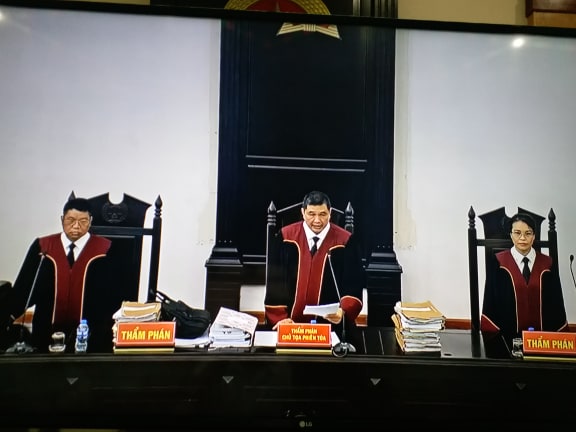 Đúng 8h40, HĐXX phúc thẩm của TAND Cấp cao tại Hà Nội bước vào làm việc. Hội đồng xét xử phúc thẩm gồm 3 người là thẩm phán cao cấp của TAND Cấp cao. Chủ tọa phiên tòa là ông Nguyễn Vinh Quang, có 8 luật sư đăng ký bào chữa cho 5 bị cáo, trong đó ông Trần Việt Tân có hai người.