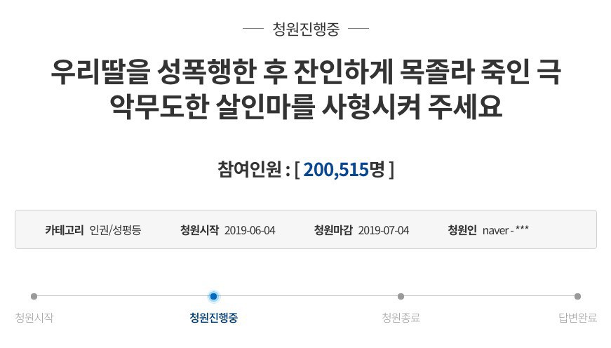 Ngày 4/6 vừa qua, bố B đã đệ đơn lên Nhà Xanh, yêu cầu mức án tử hình cho tên tội phạm đã giết chết con gái ông. Tính đến chiều ngày 9/6, lá đơn này đã nhận được hơn 200 nghìn chữ ký ủng hộ, người dân Hàn Quốc cũng hy vọng cảnh sát nhanh chóng hoàn thành cuộc điều tra, trả lại công bằng cho người đã khuất.