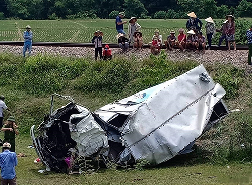 Xe tải bị tàu hàng tông nát bét khi băng qua đường sắt. Tàu hàng Bắc - Nam tông phải xe tải. Chiếc xem bị biến dạng còn tài xế bị đứt 1 chân.