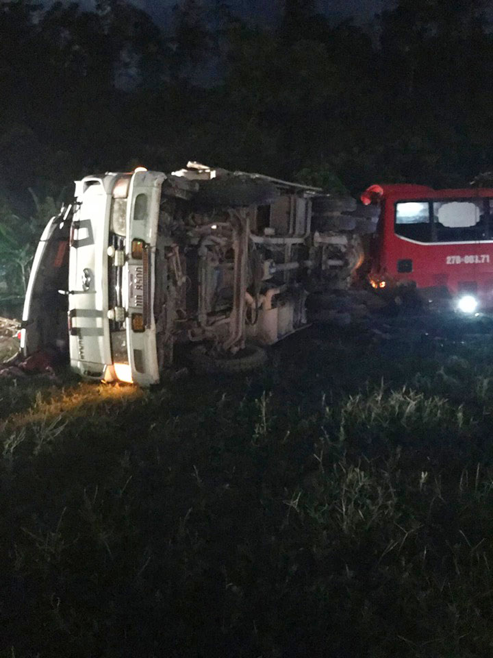 Sau tai nạn, chiếc xe tải lật ngang đường. Ảnh Đ.Q