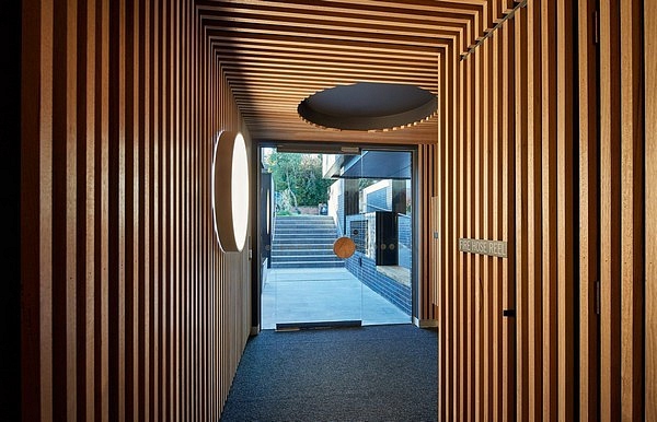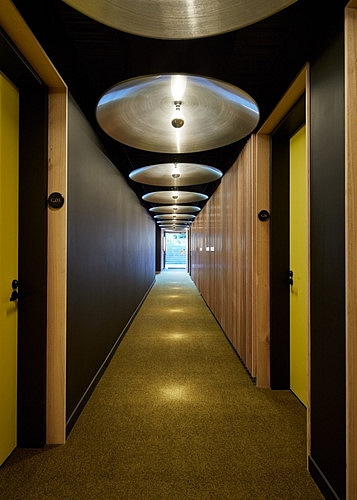 Khu vực hành lang dẫn vào các phòng cũng được chú trọng trong thiết kế với các bức tường bằng gỗ cây tuyết tùng cùng thảm lót màu xám.