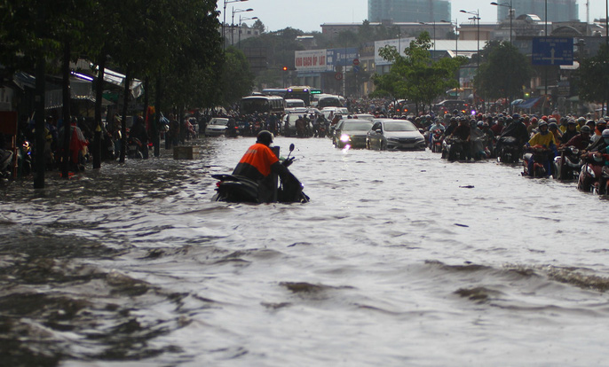 Cách đó không xa, đường Phạm Văn Đồng đoạn qua phường Linh Đông (quận Thủ Đức), nước cũng dâng cao hơn nửa bánh xe. Hàng loạt phương tiện chết máy, giao thông "tê liệt" sau khi mưa đổ xuống chừng 30 phút.