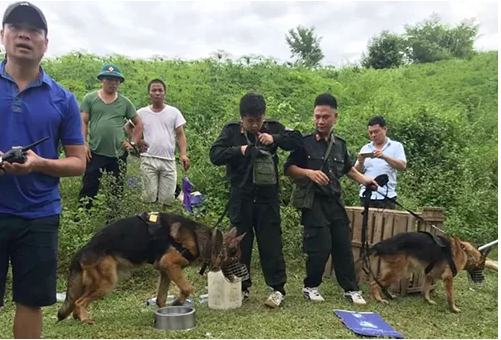 Cảnh sát huy động chó nghiệp vụ truy lùng nghi phạm. Ảnh: Đàm Quang.