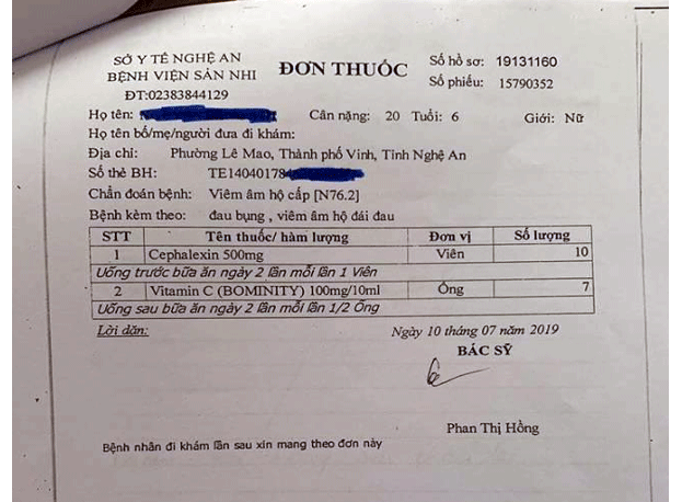 Đơn thuốc được cho là của con gái anh Tr. khi cháu được đưa đến Bệnh viện Sản Nhi Nghệ An khám. Ảnh: N.H