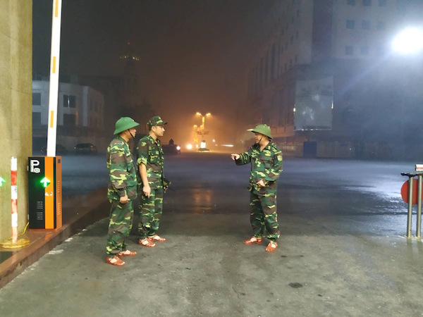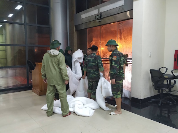 Chiến sĩ đồn biên phòng cửa khẩu Móng Cái mang chăn để chặn nước vào khu vực xuất nhập cảnh
