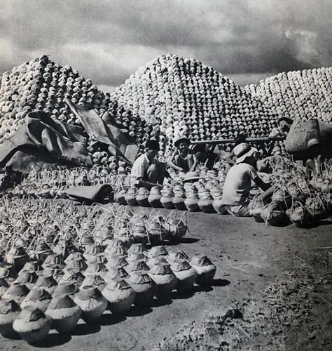Những chiếc tĩn dùng để đựng nước mắm chất thành đống cao tại một tỉnh Nam Kỳ.