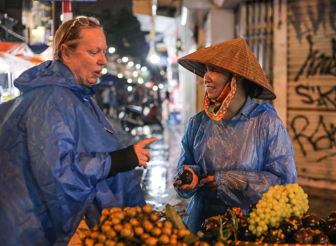 Một vị khách nước ngoài cũng đội mưa mua chút trái cây