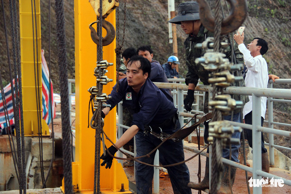 Công nhân kỹ thuật công ty nối dây cáp vào để kéo phay tràn lên - Ảnh: TRUNG TÂN