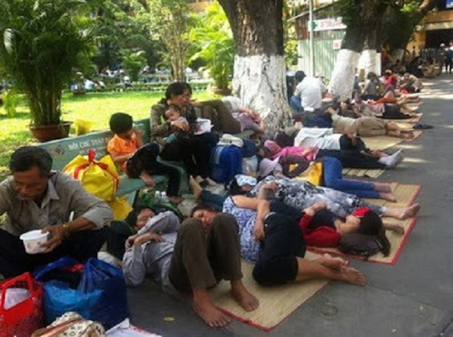 Họ lên đây từ trước Tết, đợi mãi mới tới phiên con được khám. Trong khi chờ thì cứ ngồi, nằm, ngay ở hành lang bệnh viện. Anh chị không phải là cặp vợ chồng duy nhất ngủ ở ngoài này. Số người chờ khám cho thân nhân hay chờ khám cho chính mình nhiều hơn số giường của bệnh viện có, nên người chờ đợi, ăn, ngủ, tràn lan ra tới hành lang.