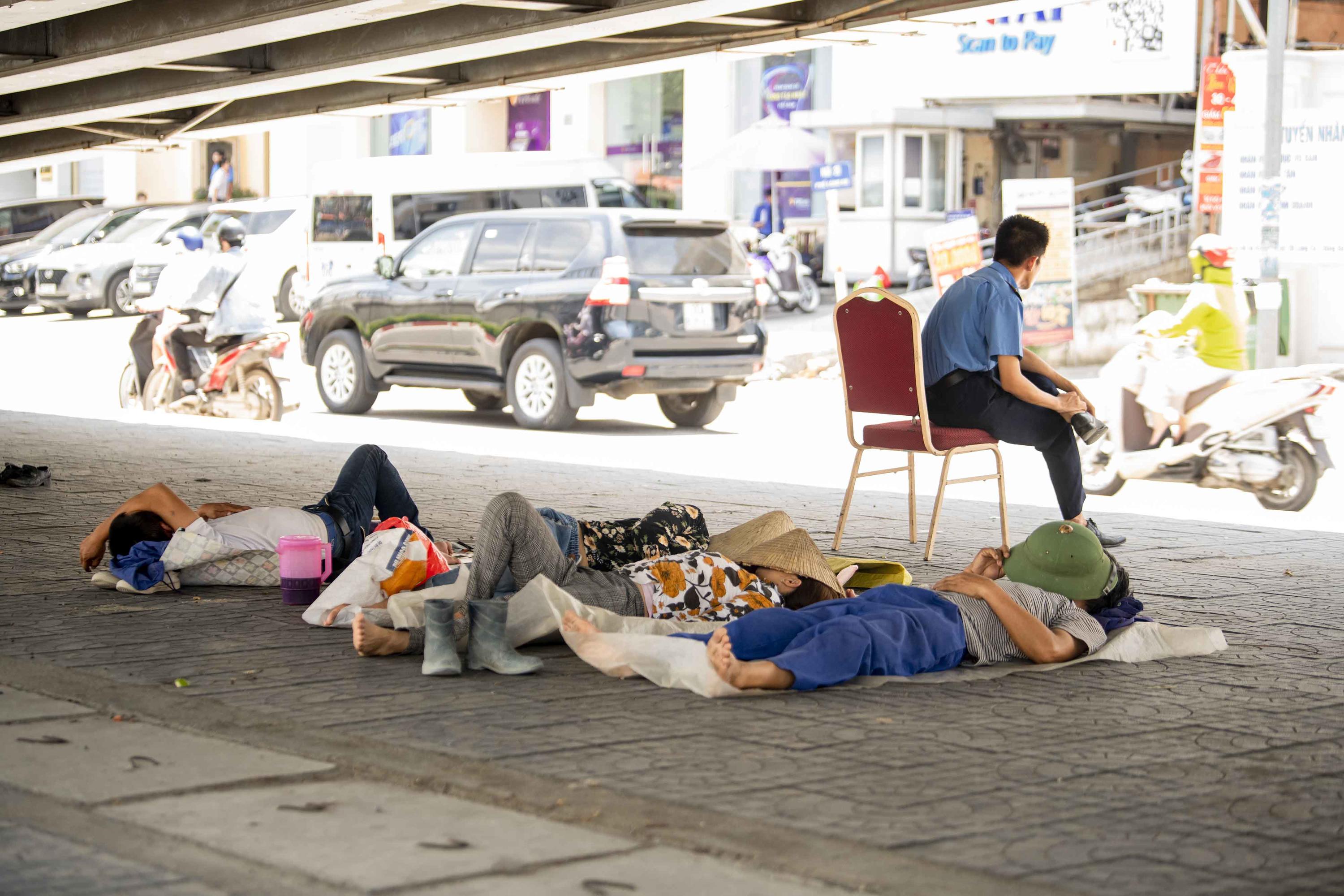 Ngay tại chân cầu vượt Láng Hạ giao cắt với Huỳnh Thúc Kháng rất nhiều người dân lựa chọn làm nơi tranh thủ chợp mắt vào buổi trưa.