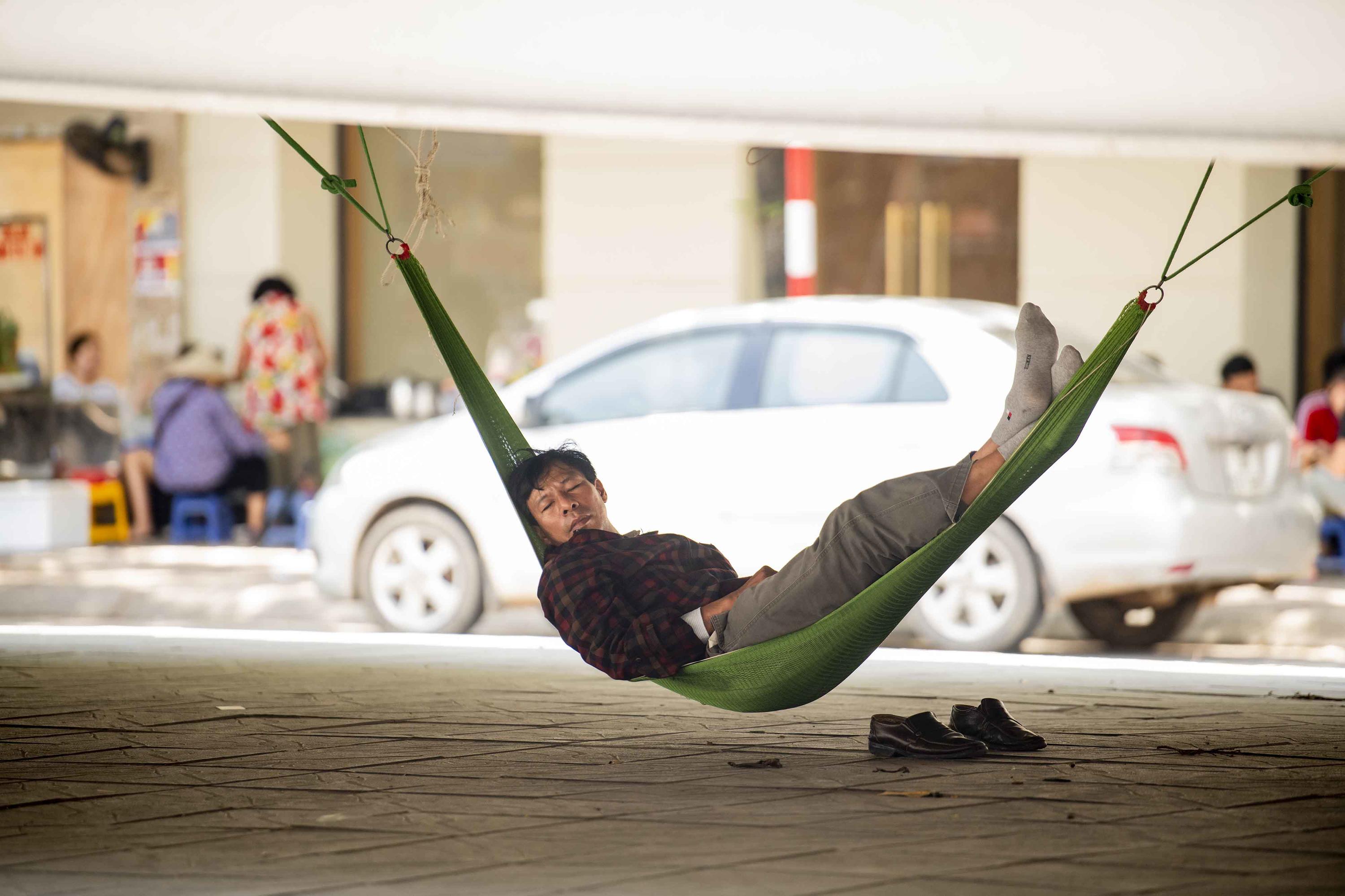 Cũng tại chân cầu vượt Đường Láng giao nhau với Lê Văn Lương một người dân lao động mắc võng ngủ tránh nóng.