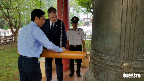 Đại sứ Mỹ cùng lãnh đạo tỉnh Quảng Trị thỉnh 9 tiếng chuông mời anh linh liệt sĩ về chứng giám - Ảnh: QUỐC NAM