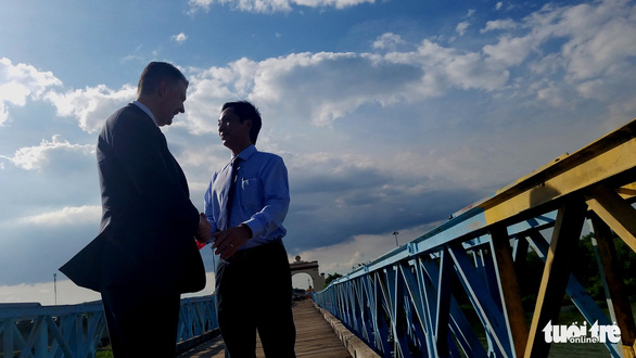 Ngay tại điểm ngày xưa là ranh giới chia cắt hai miền trên di tích cầu Hiền Lương, đại sứ Mỹ Daniel Kritenbrink và ông Hoàng Nam - phó chủ tịch tỉnh Quảng Trị - cùng bắt tay trò chuyện với nhau - Ảnh: QUỐC NAM
