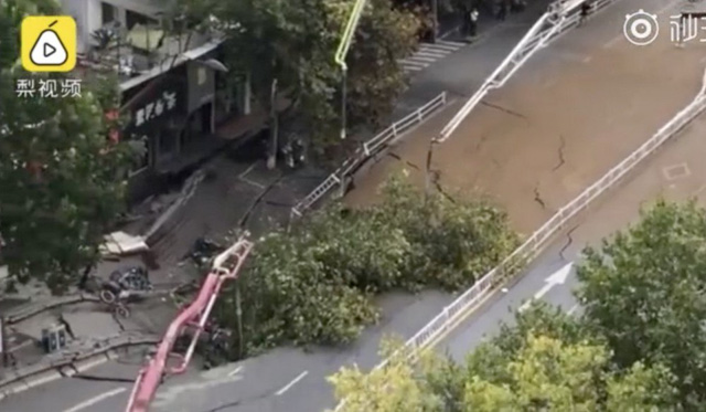 Khói vàng cuồn cuộn, đường 4 làn xe bị sụp, ống dẫn khí gãy đứt, các tòa nhà nứt toác, lắc lư, sau vụ sập đường hầm tàu điện ngầm ở Hàng Châu, Trung Quốc.