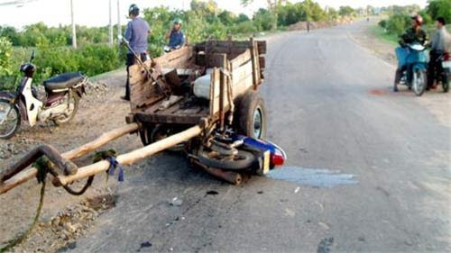 -Tôi dắt con bò cái của tôi ra, đẩy nó đến trước cái xe kéo của tôi, chòang cái càng xe lên cổ nó cột lại để nó kéo đống khoai ra chợ thì bất thình lình tên lái xe chở hàng kia từ đâu phóng đến rất nhanh tông ngang vào xe tôi. Tôi văng xuống bờ mương bên này đường, đau đớn ghê lắm, không thể nhúc nhích được.