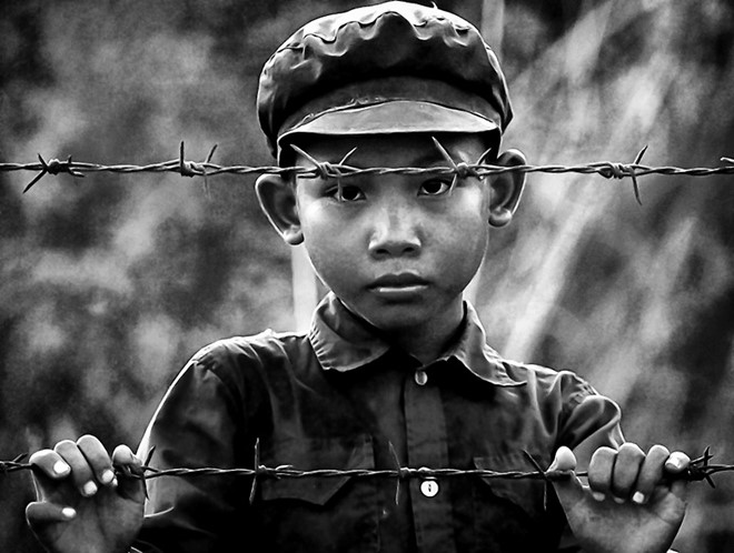 Một bé trai Campuchia đứng trong trại tị nạn ở Thái Lan. Gia đình đưa em sang Thái Lan để thoát chế độ diệt chủng ở Campuchia. Ảnh: layersofthailand.com .