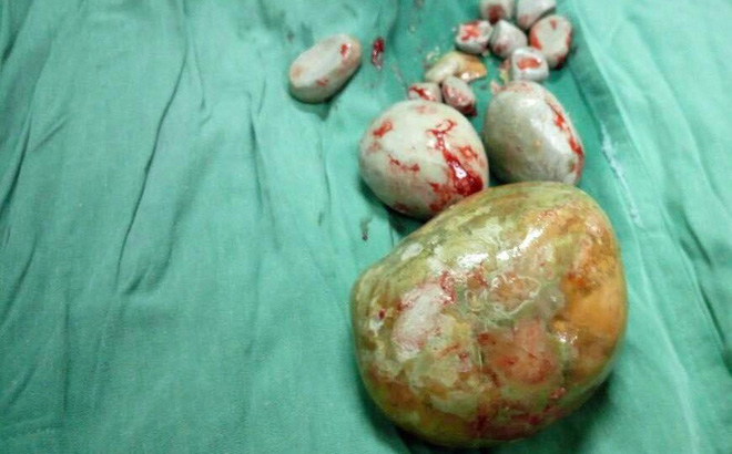 Trong lúc phẫu thuật, các bác sĩ đã lấy ra rất nhiều sỏi từ 3cm - 8cm (khoảng 15 viên), đặc biệt có một viên sỏi rất to khoảng 12 cm nằm trong một túi thừa bên phải, cạnh bàng quang đè lên niệu quản vùng chậu phải, gây ứ nước thận, mô xung quanh túi thừa rất dính do viêm, bóc tách túi thừa lấy viên sỏi 12cm ra bên trong có ít mủ và cặn trắng.