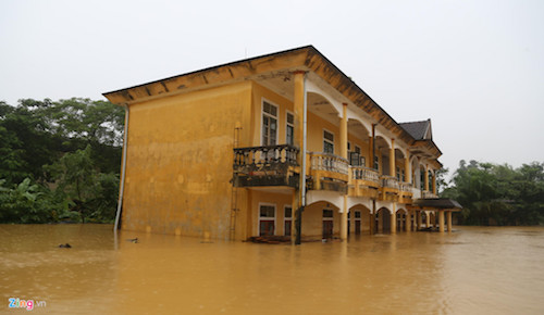 Ba ngày qua, thủy điện Hố Hô xả lũ cộng với mưa dồn dập khiến nước sông đục ngầu dâng cao. Hầu hết thôn, xóm bị ngập hơn 2 mét.