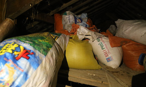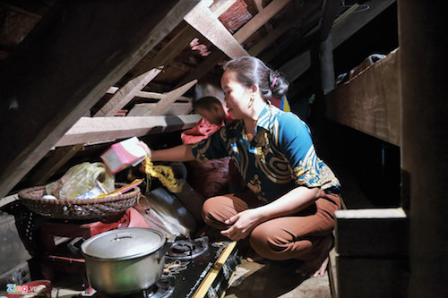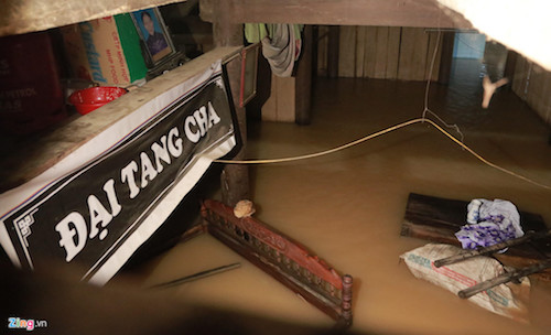 Bên dưới căn nhà nhỏ ngổn ngang đồ đạc. Bố mẹ mới mất chưa lâu, nước lũ lại đến sớm khiến chị Lương phải đưa di ảnh người quá cố lên gác.