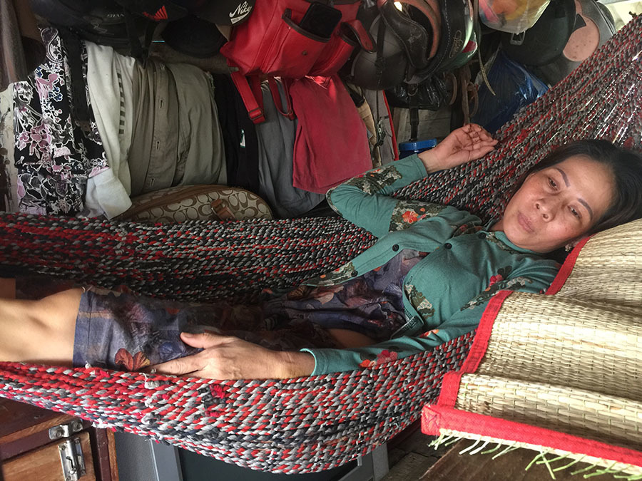 Chỉ khoảng trên bằng gỗ bóng loáng dùng làm chỗ nằm ngủ, còn lại chứa vật dụng sinh hoạt. Không có một thứ gì đáng giá. Ở góc bè, trên chiếc võng, một phụ nữ đang nằm.