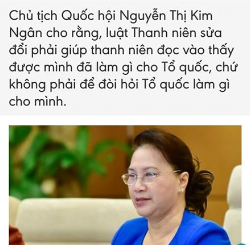 Nghe chị Ngân đòi sửa luật để thanh niên, nhìn vào đó, thấy mình đã làm gì cho Tổ quốc, chứ không phải đòi hỏi Tổ quốc làm gì cho mình. Há há!!! Rảnh thiệt!