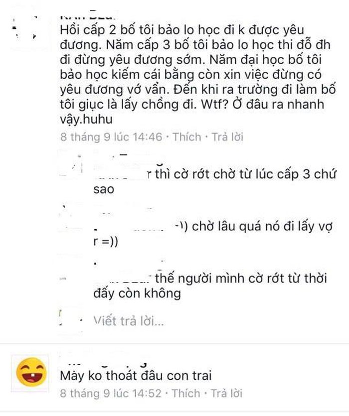 “Hồi cấp 2 bố tôi bảo lo học đi không được yêu đương. Năm cấp 3 bố tôi bảo lo học đi đỗ đại học đi đừng yêu đương sớm. Năm đại học bố tôi bảo học kiếm cái bằng còn xin việc đừng có yêu, đương vớ vẩn. Đến khi ra trường đi làm bố tôi giục là lấy chồng đi. Trời ơi, ở đâu ra người yêu nhanh vậy được chứ?” – một đọc giả khác đồng cảm.