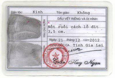 Và ngay truớc khi đuợc cấp tấm thẻ này, đuơng sự đã phải ... tụt quần cho công an khám, thì chúng nó mới biết cái nốt ruồi này chứ ? Chúng còn lấy thuớc để đo, mới biết chính xác " 3,5cm " !!