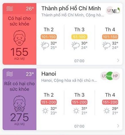 Tương ứng với chỉ số AQI, mức độ cảnh báo hiện lên chủ đạo với gam màu tím – mức được cho là “very unhealthy” (rất không tốt cho sức khoẻ). Đặc biệt tại Tây Hồ vào lúc 8h sáng, chỉ số AQI lên tới 302 tức cảnh báo màu nâu, mức độ cảnh báo cao nhất “gây nguy hiểm” cho sức khoẻ, cần tránh hẳn việc ra ngoài.
