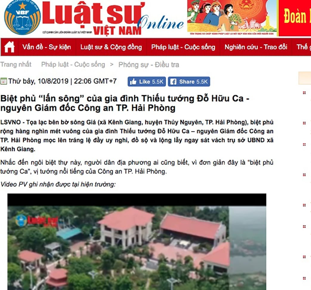 “Tạp chí điện tử Luật Sư Việt Nam bị tước giấy phép trong hai tháng và phạt 50 triệu đồng ($2,154) vì đưa tin sai sự thật gây ảnh hưởng rất nghiêm trọng trong bài viết ‘Biệt phủ lấn sông’ về gia đình Thiếu Tướng Đỗ Hữu Ca, cựu giám đốc Công An thành phố Hải Phòng, đăng ngày 10 Tháng Tám, 2019,” quyết định do ông Lưu Đình Phúc, cục trưởng Cục Báo Chí, Bộ Thông Tin Truyền Thông CSVN, cho hay.