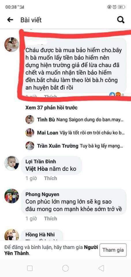 Vụ cháu bé học lớp 6 bị bà nội giết hại. Bước đầu bà nội đã khai nhận hành vi giết người với cơ quan công an. Nghi ngờ mục đích bà nội giết cháu vì tiền bảo hiểm đền bù.