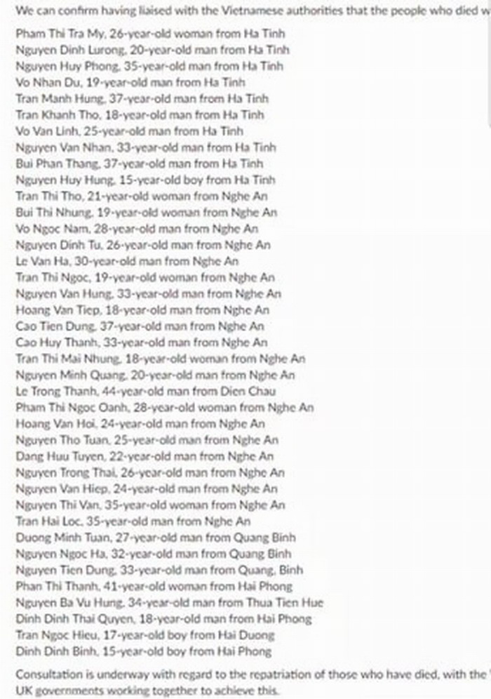 Danh sách 39 người chết trong xe thùng: Bao gồm 21 người Nghệ An, 10 người Hà Tĩnh, 3 người Quảng Bình, 3 người Hải Phòng, 1 người Hải Dương, 1 người Thừa Thiên Huế.