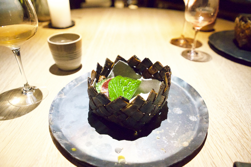 Món đầu tiên là súp nấm, nhưng bạn sẽ không tìm thấy nấm đâu cả ngoài một đống rêu và một cái nón thông bên trên. Phục vụ sẽ giải thích rêu và nón thông không ăn được, bên dưới mới là món súp nấm.
