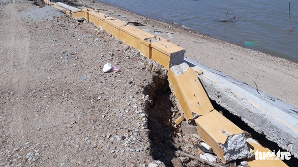 Sau khi bị sóng đánh vỡ vụn, bờ kè này để lộ ra nhiều đoạn dọc bờ sông toàn bằng bêtông, không có lõi thép bên trong, phía dưới toàn cát, không có chân trụ.