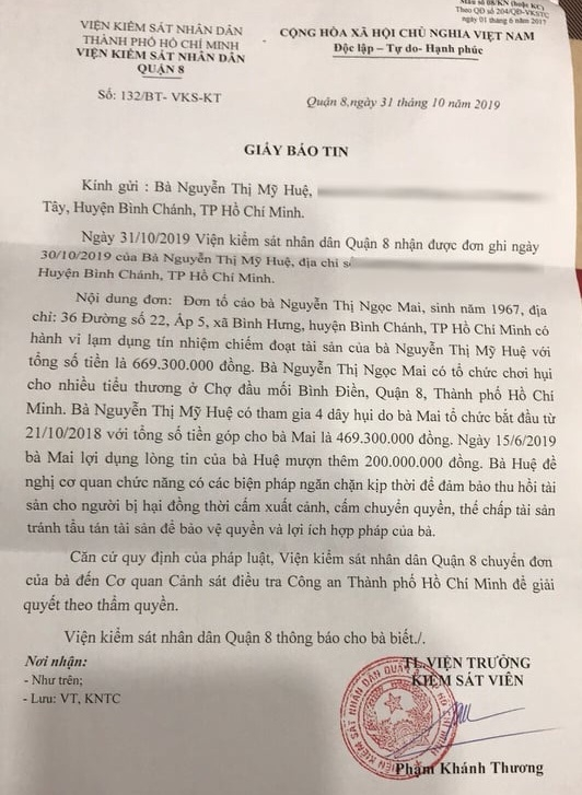 Trong đơn tố cáo, chị Nguyễn Thị Mỹ Huệ (sinh năm 1985) cho biết: “Tôi có góp 4 dây hụi cho bà Nguyễn Thị Ngọc Mai với số tiền 469,3 triệu đồng. Theo thỏa thuận thì mỗi dây hụi góp trong vòng 12 tháng, tương đương 12 kỳ sẽ được hốt hụi. Nhưng dây hụi thứ nhất đến kỳ thứ 12 là đến lượt tôi hốt thì bà Mai hứa hết lần này đến lần khác, rồi còn dụ tôi tiếp tục tham gia thêm các dây hụi khác với hứa hẹn sau này sẽ được ưu tiên hốt hụi.