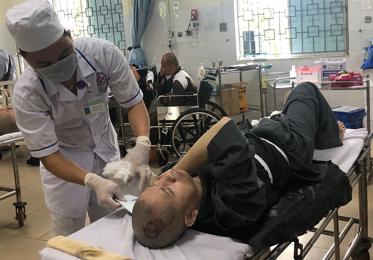Bác sĩ Bệnh viện Đa khoa Quảng Ngãi cấp cứu một sự thầy bị chấn thương đầu. Ảnh: Phương Trần.
