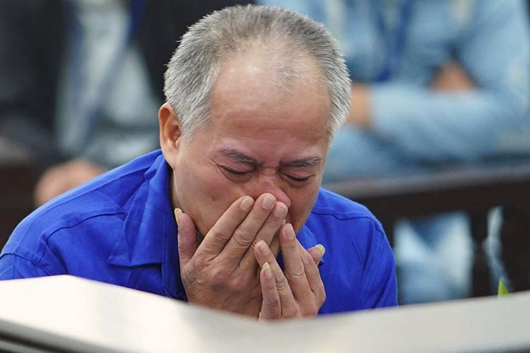 Bị cáo Đông liên tục khóc trong phần xét hỏi. Ảnh: Phạm Dự.