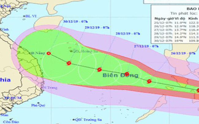 Đến 7 giờ ngày 26-12, vị trí tâm bão Phanfone ở khoảng 12,9 độ Vĩ Bắc; 118,3 độ Kinh Đông, cách đảo Song Tử Tây khoảng 480 km về phía Đông Đông Bắc. Sức gió mạnh nhất vùng gần tâm bão mạnh cấp 11-12, giật cấp 14. Cấp độ rủi ro thiên tai: cấp 3.