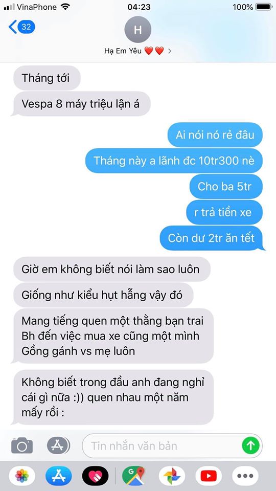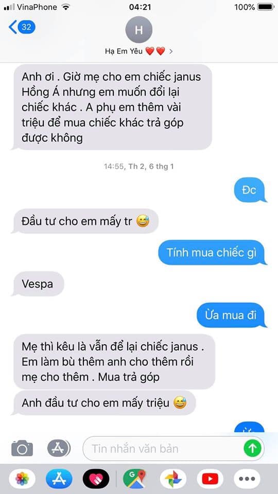 Ban đầu, cô gái ngỏ lời xin người yêu phụ tiền để mua trả góp xe, “đầu tư cho em mấy triệu”.