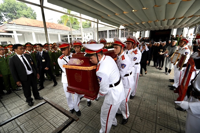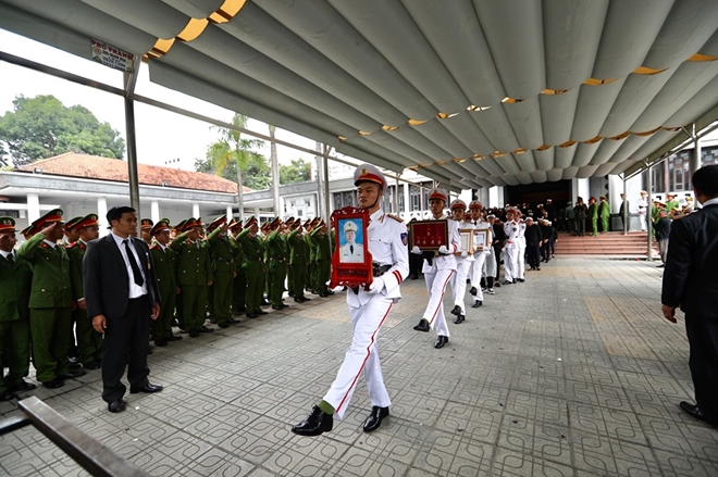 Để tỏ lòng thương tiếc vô hạn đối với 3 liệt sĩ, trước giờ tiễn biệt các liệt sĩ về nơi an nghỉ cuối cùng, các lãnh đạo Đảng, Nhà nước, lãnh đạo Bộ Công an, chính quyền địa phương và toàn thể gia quyến dành một phút mặc niệm để vĩnh biệt 3 liệt sĩ.