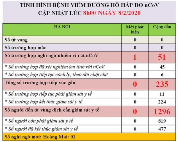 Riêng tại Hà Nội, báo cá*o cập nhật của Sở Y tế thàn*h phố vào lúc 8h sáng nay, tuy chưa có ca mắc song đã có 51 trường hợp nghi ngờ nhi*ễm corona được theo dõi y tế. Đến thời điểm này, 45 trường hợp đã có xé*t ngh*iệm âm tính.