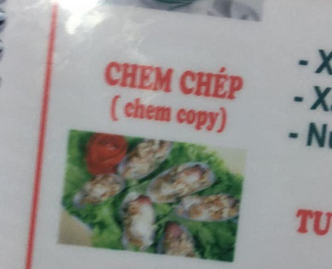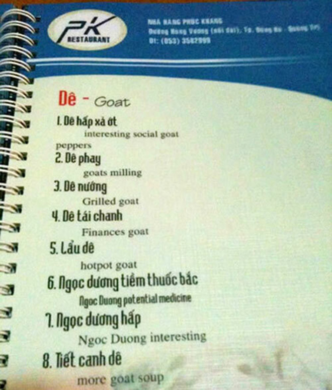 Việc dịch một số từ sang tiếng Anh để phục vụ tốt hơn các khách Tây là không có gì sai. Tuy nhiên, trình độ tiếng Anh hạn chế lại gây ra những hiểu lầm hết sức tai hại. Những ví dụ dưới đây là điển hình.