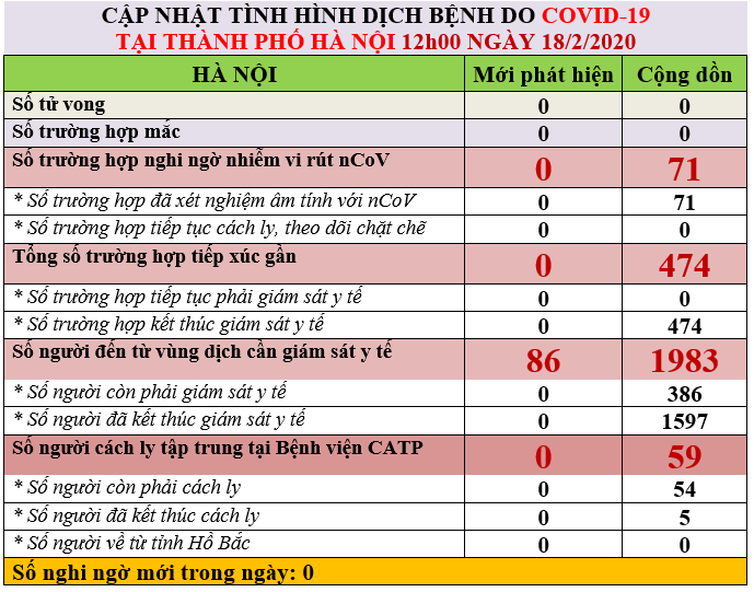 Sở Y tế Hà Nội cho biết, tính đến 12 giờ trưa 18/2, Hà Nội đã phát hiện thêm 86 người đến từ vùng dịch. Như vậy, tính đến thời điểm này, toàn TP có 1.983 trường hợp đến từ vùng dịch, trong đó 1.597 trường hợp đã kết thúc giám sát y tế, còn 386 trường hợp đang được giám sát y tế chặt chẽ theo quy định.