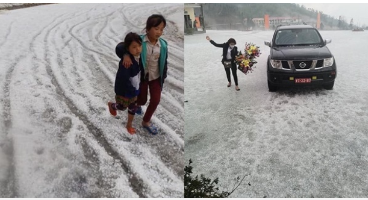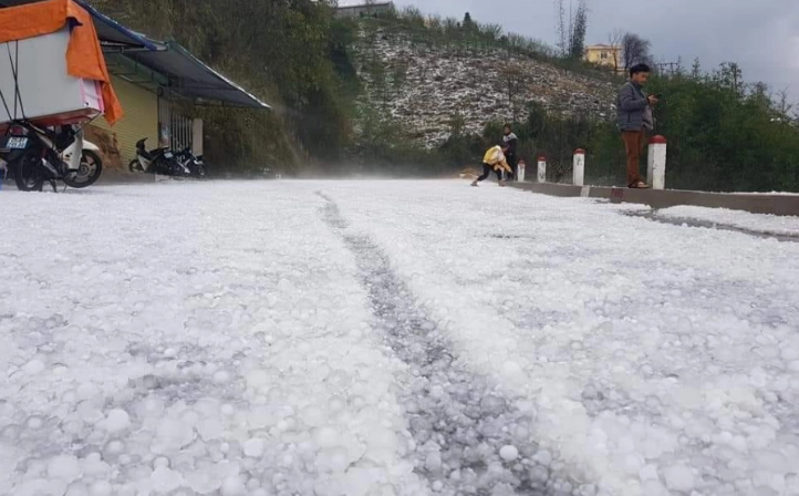 Mưa đá rơi ngập đường trắng xóa.