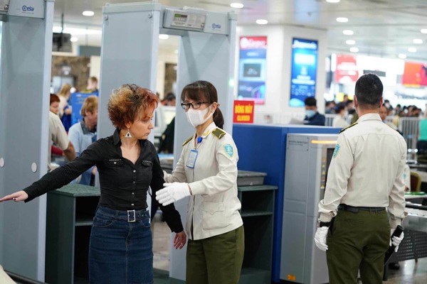 Nhân viên an ninh tại Nội Bài kiểm tra thân nhiệt khách nhập cảnh vào Việt Nam. Ảnh: Vũ Điệp