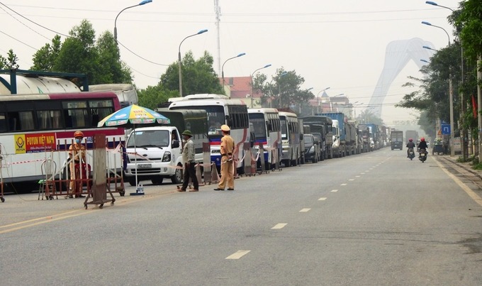 Chiều 9/4, tại chốt kiểm soát Covid-19 trên quốc lộ 18A, địa phận xã Bình Dương, thị xã Đông Triều giáp với thành phố Chí Linh (Hải Dương), hàng trăm xe tải, xe container... nối đuôi nhau thành hai hàng chờ làm thủ tục qua chốt kiểm soát khi vào Quảng Ninh. Mọi việc diễn ra theo trật tự.
