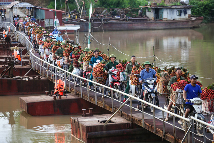 Cây cầu phao chòng chành bằng sắt được giữ nổi bằng những chiếc phao cỡ lớn phía dưới. Đường xuống cầu phao ở cả hai đầu đều có độ dốc lớn, trong khi mỗi chuyến vải nặng vài tạ khiến việc lưu thông của người dân gặp rất nhiều khó khăn. Phần lớn mỗi chuyến vải đều phải có người hỗ trợ đẩy xe vải lên dốc.
