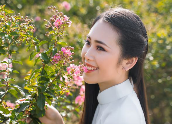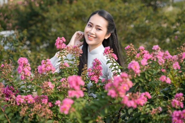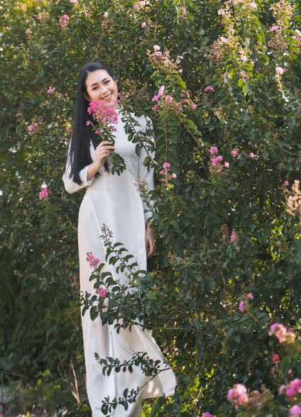 Khoác trên mình bộ áo dài trắng truyền thống, Á khôi khoe những đường nét mềm mại, dịu dàng nhưng không kém phần quyến rũ bên những cánh hoa tường vi mong manh. Đây là loài hoa đẹp, cánh mỏng và có giá trị thẩm mỹ cao nên được rất nhiều người yêu thích. Huyền Trang cũng không ngoại lệ khi chọn thực hiện bộ ảnh bên những bông hoa tường vi đang khoe sắc rực rỡ.