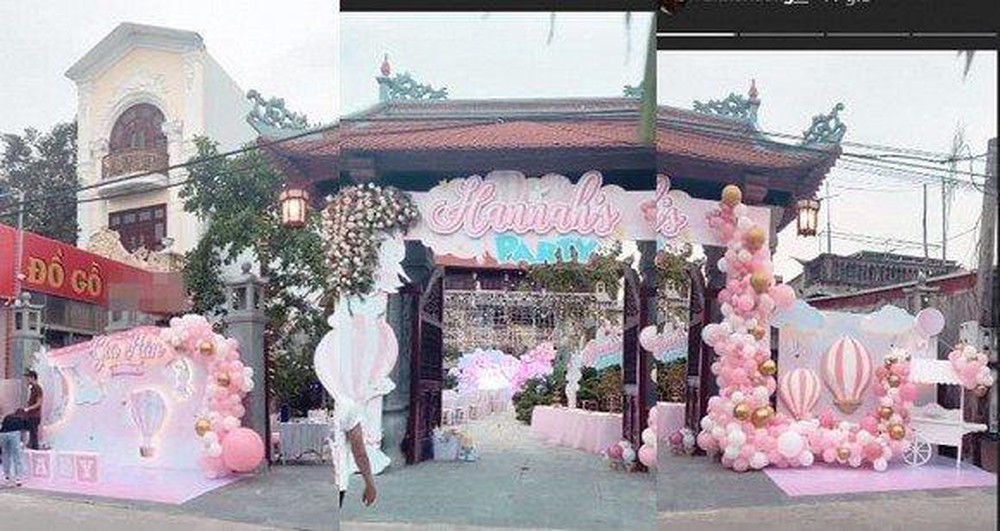 Cổng chào hoành tráng dịp đầy tháng con gái Thu Hương trong biệt thự gỗ ở Hải Hậu.